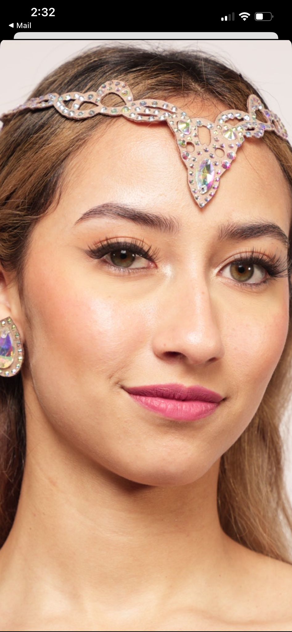 This hair piece may be attached with hair pins on the side and eyelash glue to secure the main rhinestone.