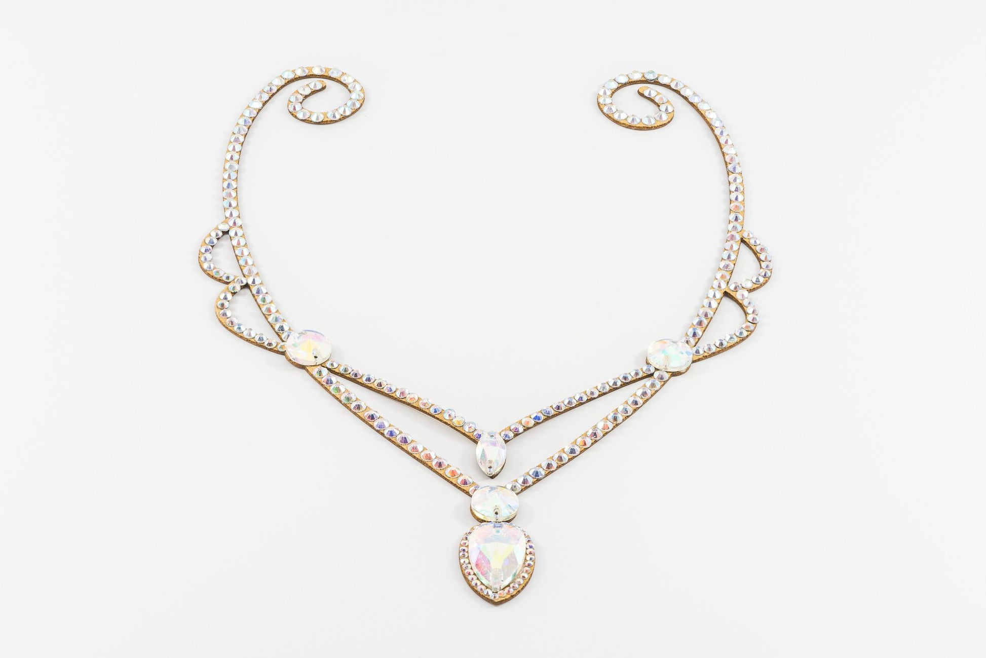 This hair piece may be attached with hair pins on the side and eyelash glue to secure the main rhinestone.